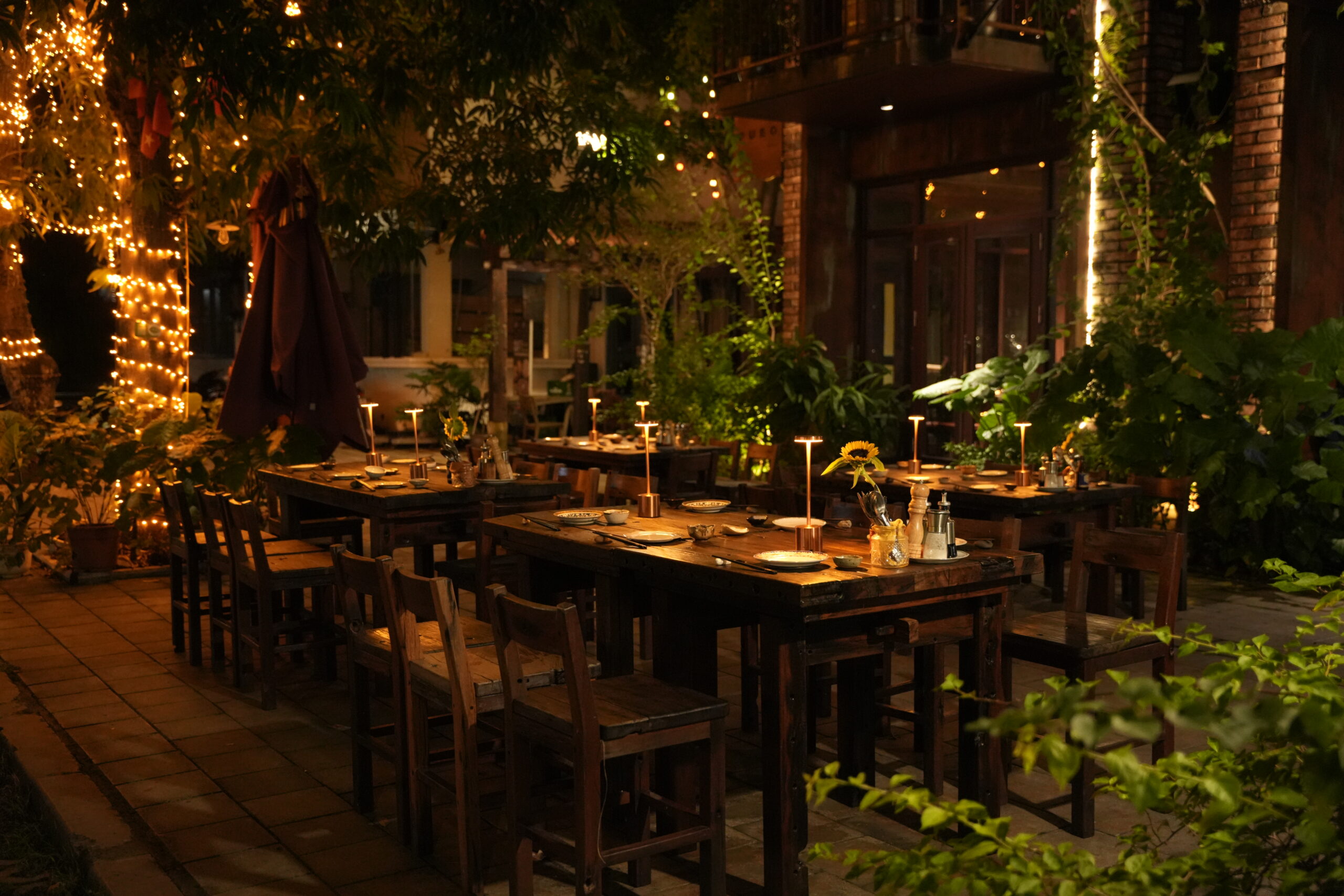 Từ khoảng sân nhỏ phủ ánh đèn và cây xanh đến ô cửa sổ nơi ánh sáng chạm nhẹ. Từ kệ trưng rượu kể về những hành trình hương vị đến mảng tường gạch cũ lưu giữ sự cổ kính của Hà Nội.